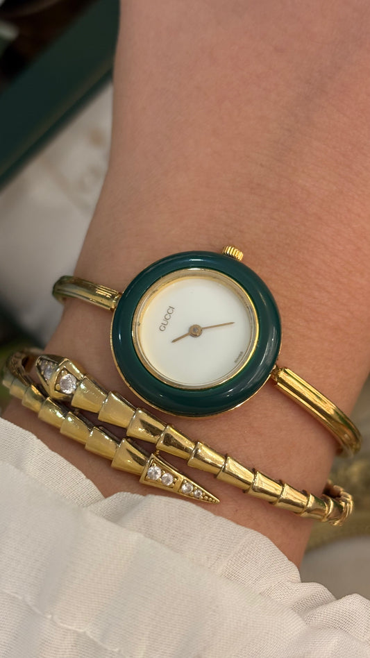 Extremely Rare Gucci Interchangeable Bezel Bangle Watch with Metal Bezel Set in Gold Tone Quartz Swiss