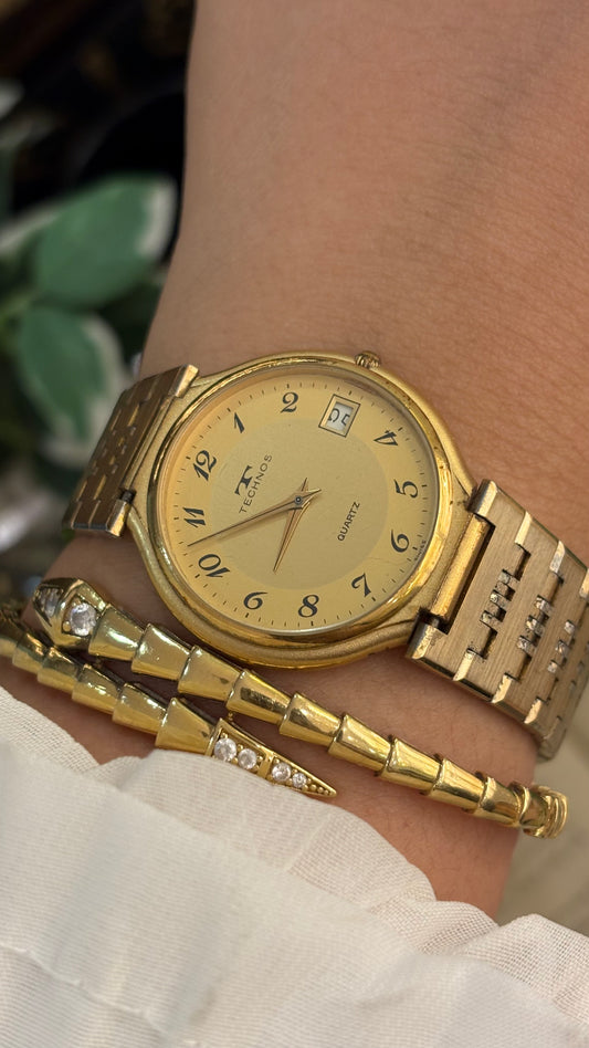 Rare Vintage Technos Swiss with Date Window Mens Dress Watch in Gold Tone Quartz