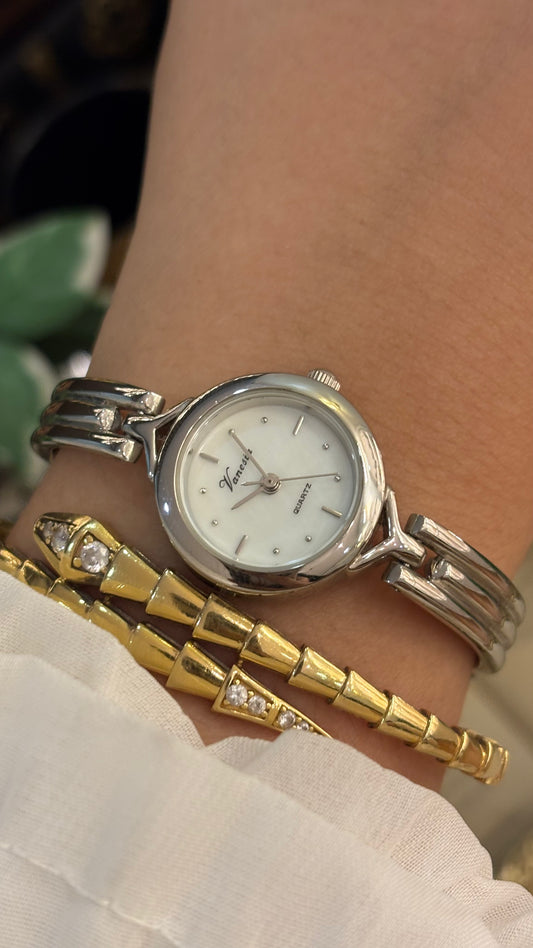 Vintage Elegant Vanessa Semi-Bangle in Silver Tone Mother of Pearl Dial Quartz