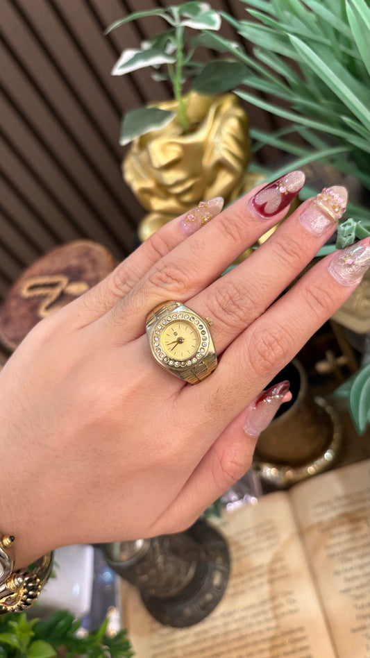 Extremely Rare Dainty Krone Rhinestone Bezel Ring Watch in Gold Tone Quartz