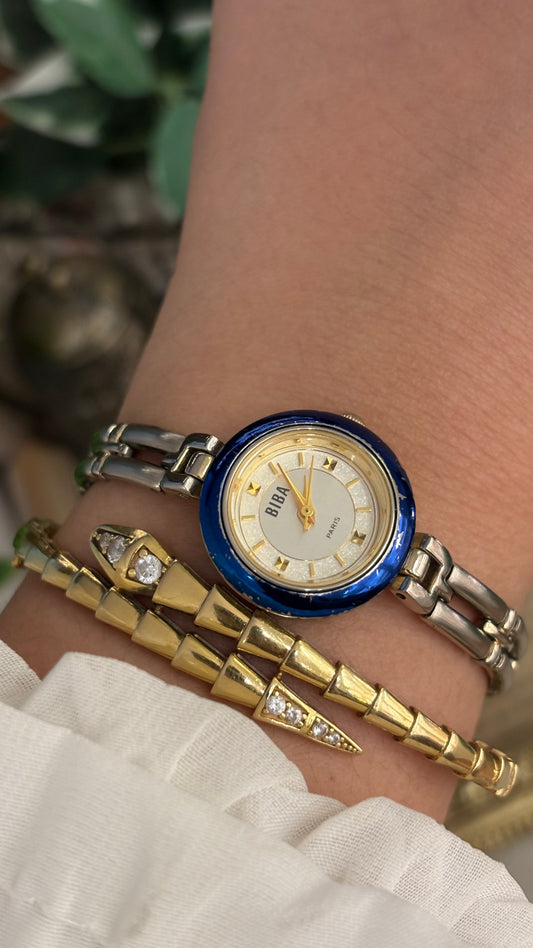 Rare Vintage BIBA Metallic Blue Bezel Chain Link Watch in Silver Tone Quartz