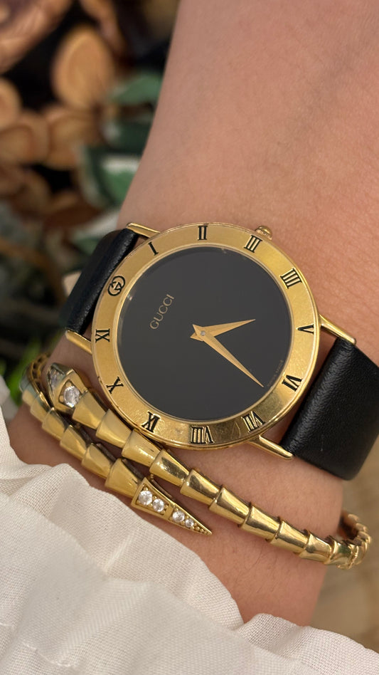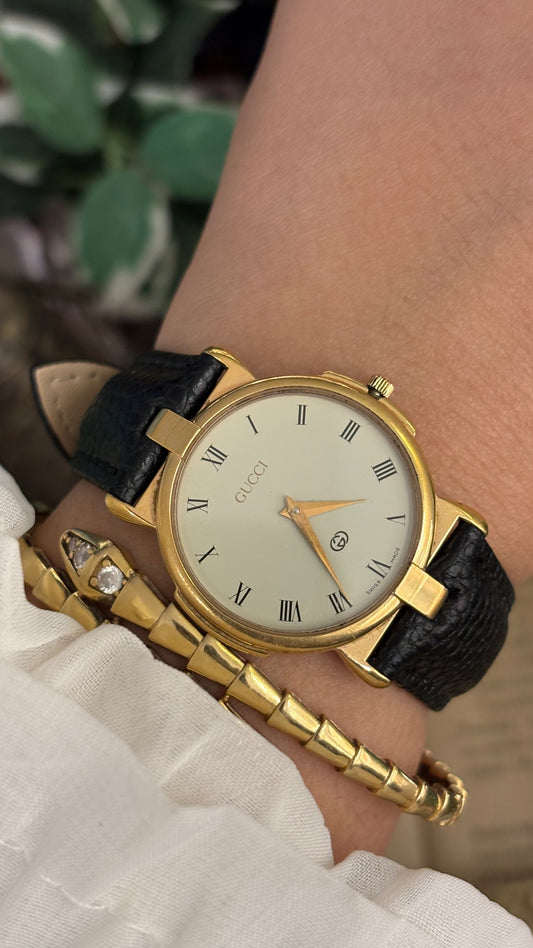 Vintage Gucci Swiss 3400F L Classic Roman Dial Watch in Gold Tone Black Leather Quartz