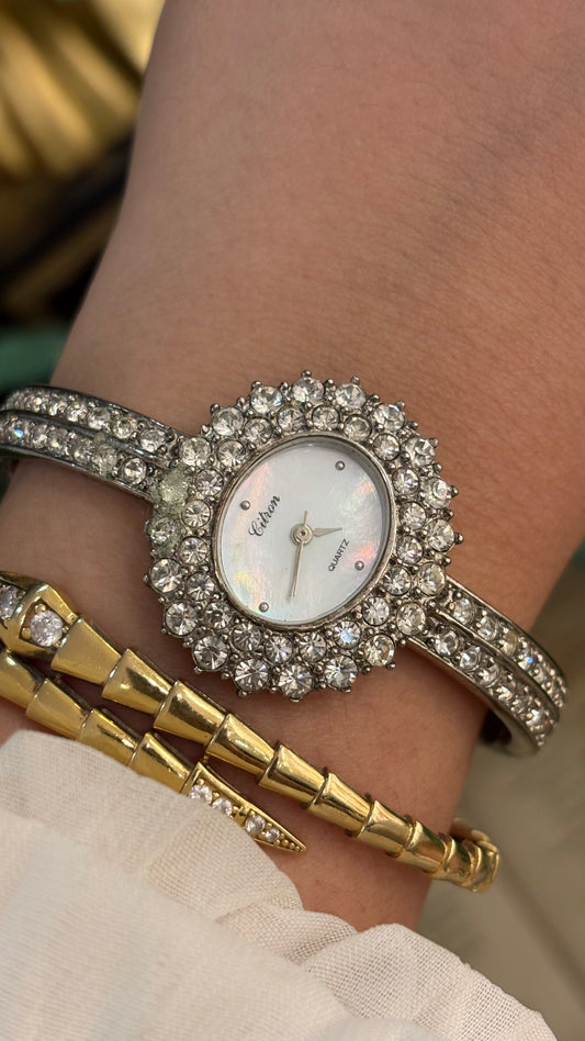 Rare Vintage Citron Bejeweled Fancy Bangle Watch in Silver Tone Mother of Pearl Dial Quartz Audemars Piguet Inspired