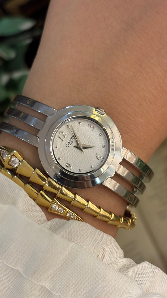 Rare Vintage Caravelle by Bulova Swiss Textured Dial Triple Bracelet Semi-Bangle Watch in Silver Tone Quartz