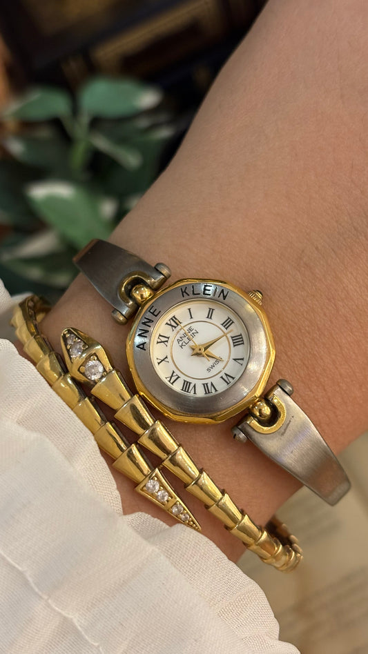 Rare Vintage Anne Klein Swiss Engraved Bezel Decagonal Dial in Two-Tone Quartz