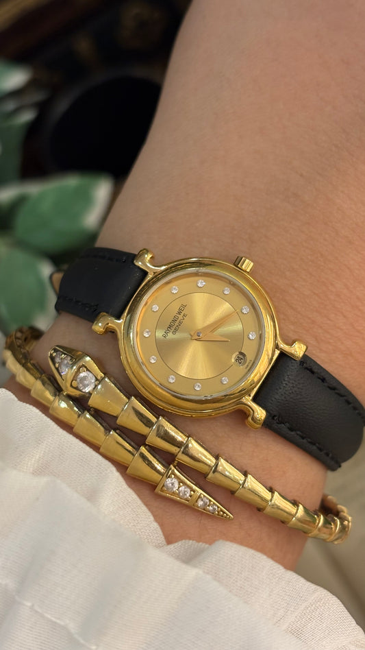 Vintage Raymond Weil Swiss Rhinestone Indices with Date Window Watch in 18K Gold Electroplated Black Leather Quartz