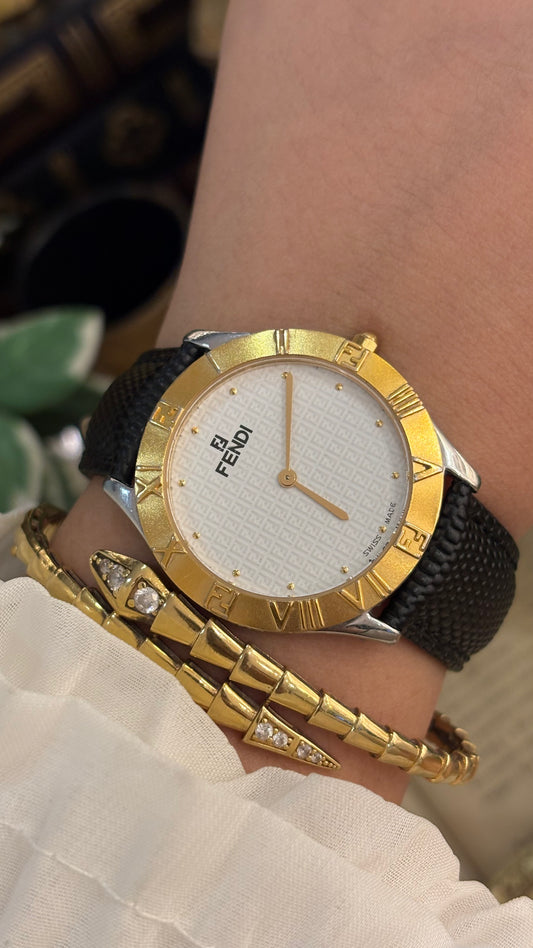 Extremely Rare Vintage Fendi Orology Swiss 2000G Watch in Gold Tone Black Leather Monogram Dial Quartz