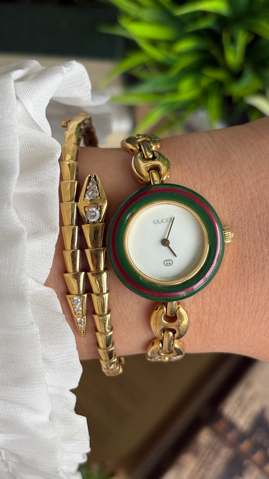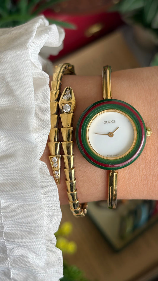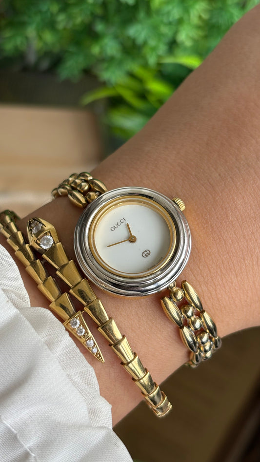 Vintage Gucci 1100L Interchangeable Bezel Set Bangle Watch in Gold Tone