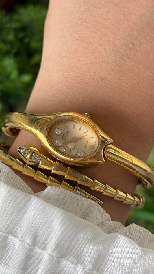 Rare Vintage Roi Peekaboo Dancing Stones Bangle Watch in Gold Tone Quartz