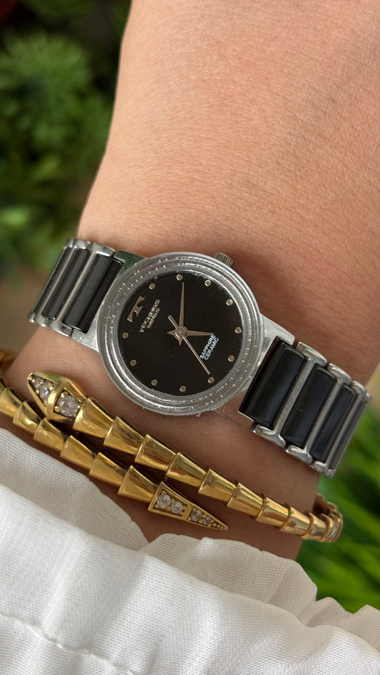 Rare Vintage Technos Ceramic Bracelet Sapphire Crystal Glass Watch in Silver Tone Quartz #00805