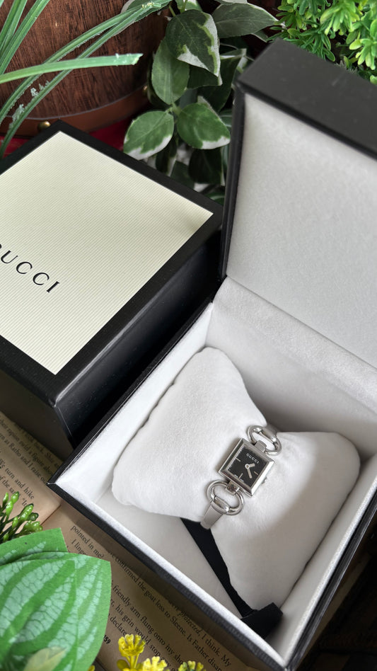 Vintage Gucci Horsebit 120 Tornabuoni Watch in Silver Tone Black Dial with Gucci Box