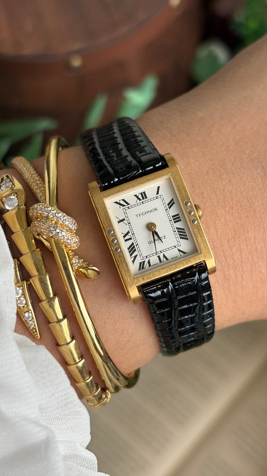 Vintage Technos Swiss Tank Watch in Black Leather Strap Cartier Style