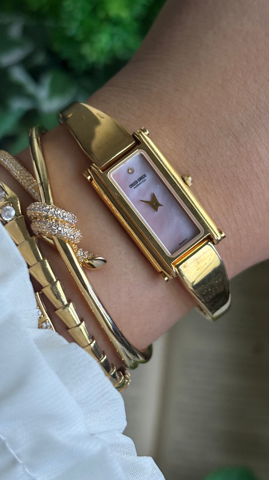 Vintage Cocco - Croco Watch in Gold Tone Gucci Style Bangle Pink Pearl Dial