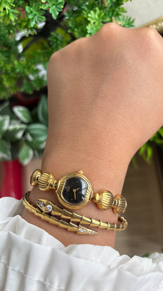 Extremely Rare Vintage Citizen Watch in Gold Tone Seashell Chain Straps Black Dial