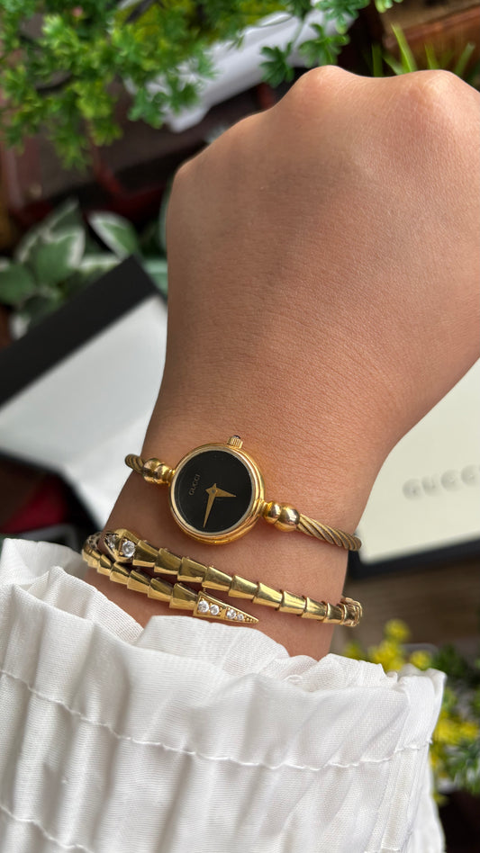 Extremely Rare Vintage 2700L Gucci Bangle Watch in Gold Tone Black Dial with Original Box