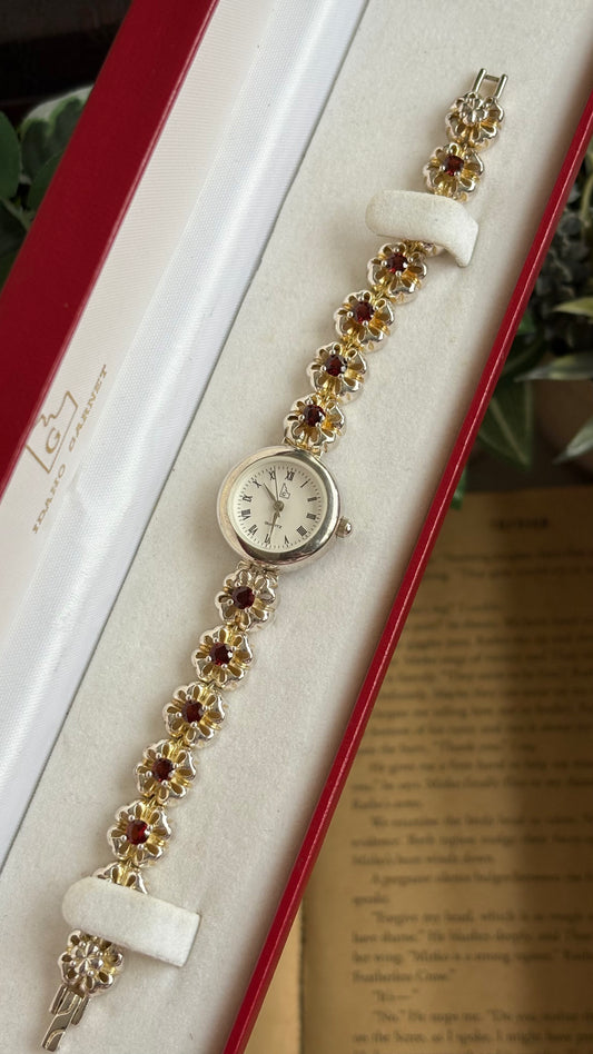 Extremely Rare Vintage Idaho Garnet Watch in Two-Tone Unique Flower Strap Design with 12 Real Garnet Accent