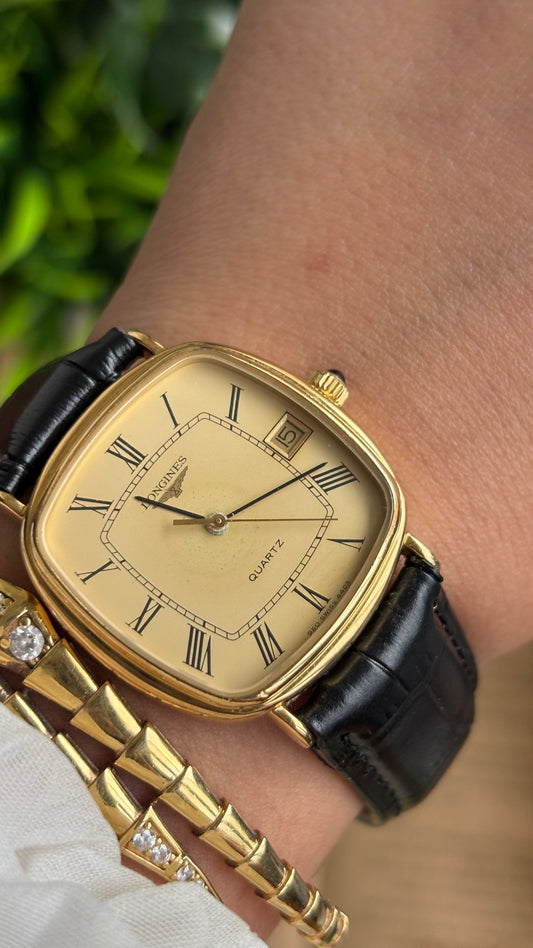 Vintage Longines Tank Watch in Black Leather Strap Roman Dial