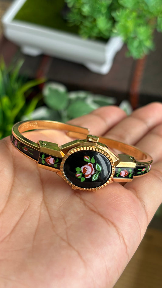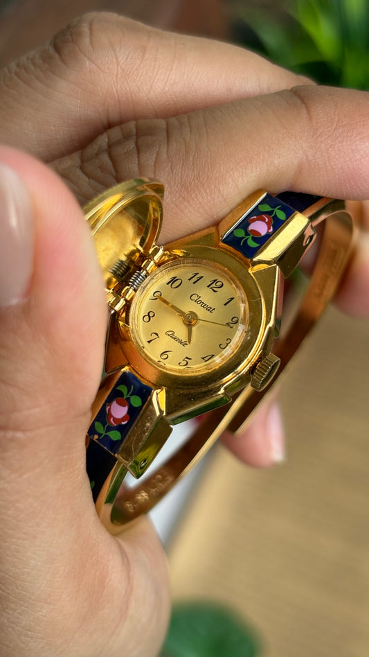 Extremely Rare Vintage Clowat by Seiko Flower Peekaboo Swiss Watch in Gold Tone Black Accent