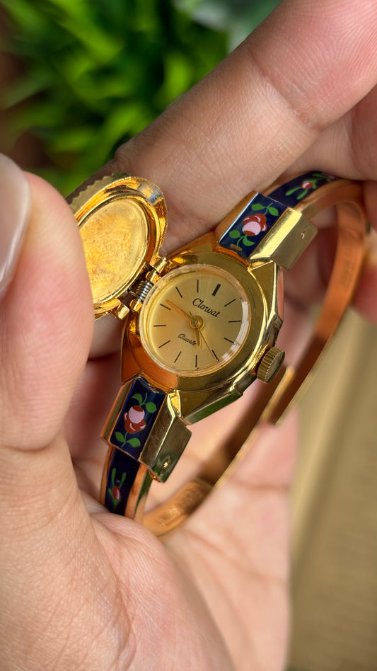 Extremely Rare Vintage Clowat by Seiko Flower Peekaboo Swiss Watch in Gold Tone Blue Accent