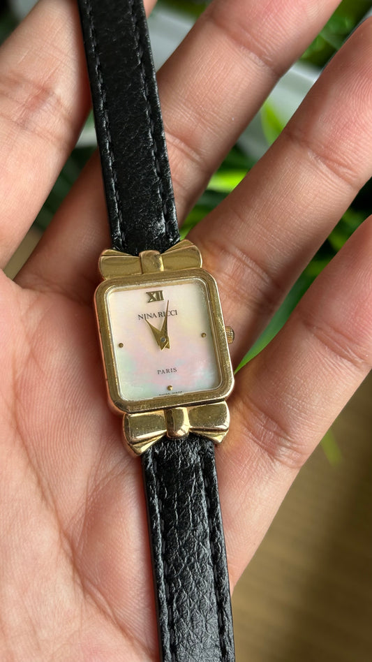 Vintage Nina Ricci Swiss Coquette Watch in Black Leather Strap with Statement Ribbon Details
