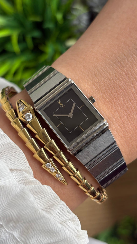 Vintage YSL Yves Saint Laurent Tank Dress Watch in Silver Tone Black Dial