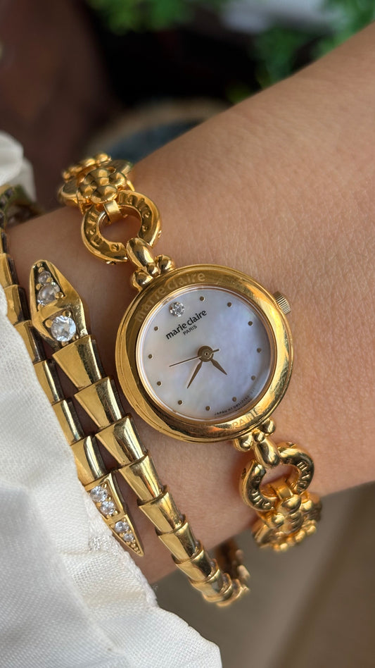 Vintage Marie Claire Paris Watch in Gold Tone Flower Straps Pearl Dial