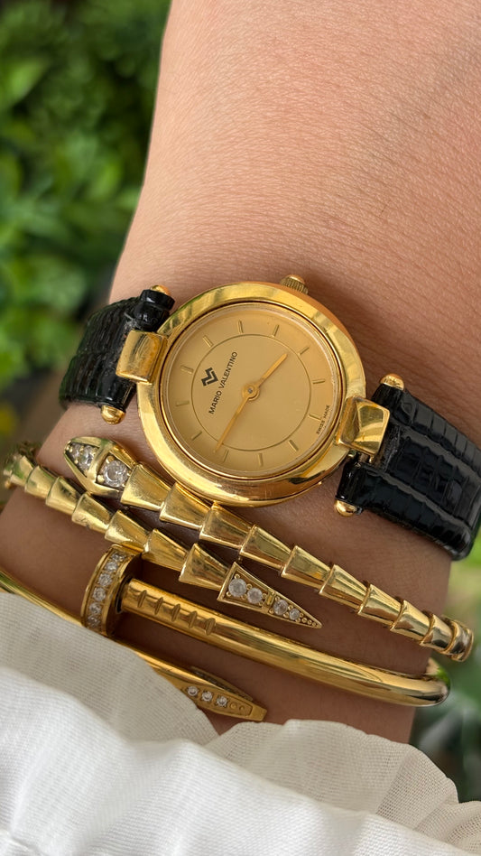 Rare Vintage Mario Valentino Swiss Elegant Minimalist Watch in Gold Tone Black Leather Gold Dial Quartz #00909