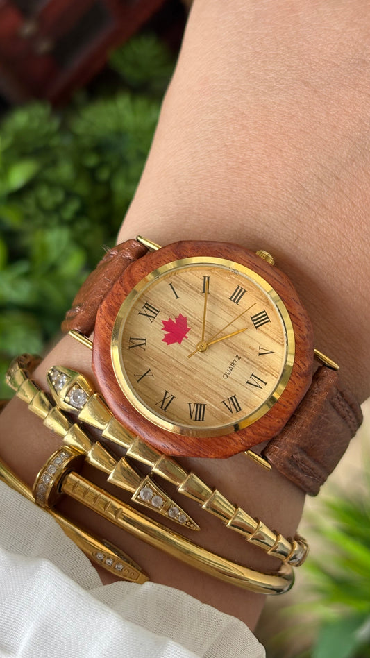 Rare Vintage Canada Wooden Watch in Gold Tone Brown Leather Quartz #00902