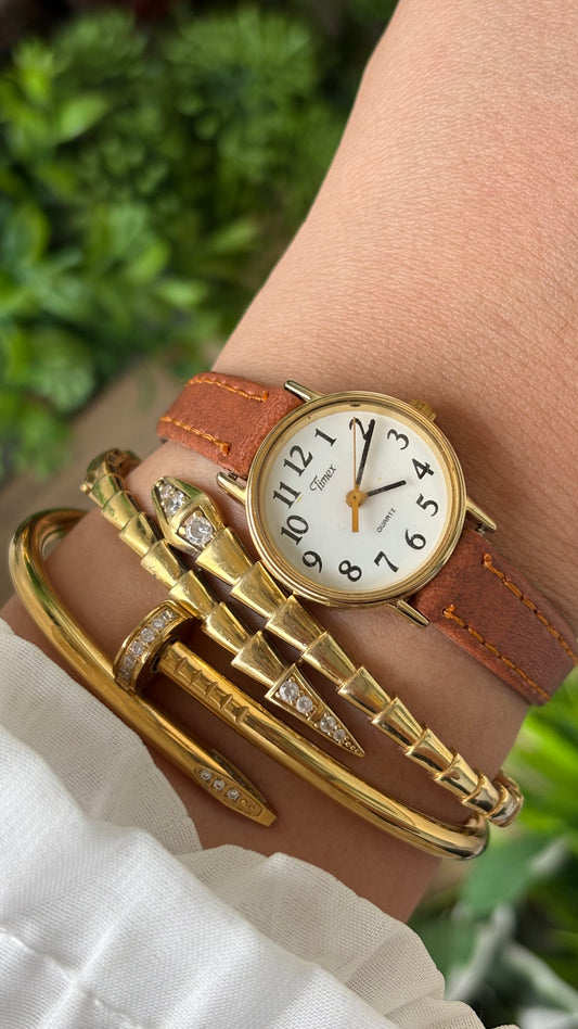 Vintage Timex Classic Watch in Gold Tone Honey Brown Leather Quartz #00933
