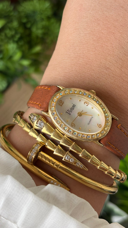 Vintage Vivani Elegant Rhinestone Bezel Watch in Gold Tone Brown Leather Mother of Pearl Dial Quartz #00930