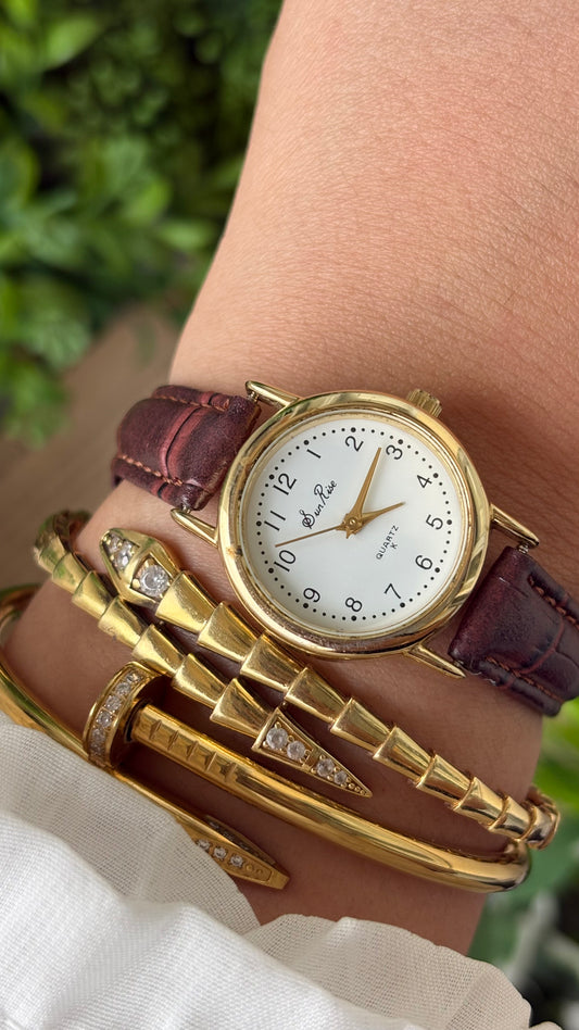 Vintage Sunrise Classic Watch in Gold Tone Maroon Leather Quartz #00922