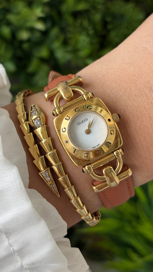 Vintage Gucci Swiss 6300L Horse-bit Watch in Gold Tone Brown Leather Quartz #00615