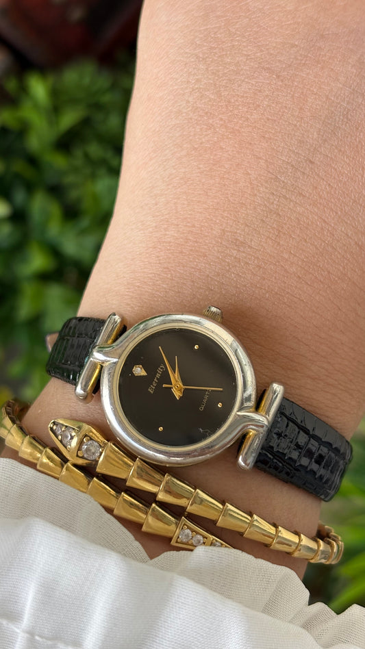 Vintage Eternity Watch in Gold Tone Black Leather Black Diamond Dial Quartz #00618