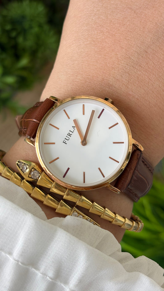 Rare Vintage Furla Minimalist Watch in Gold Tone Brown Leather Quartz #00610