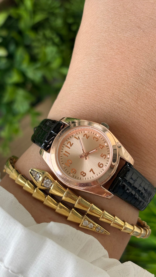 Vintage FMD Minimalist Watch in Rose Gold Tone Black Leather Quartz #00616