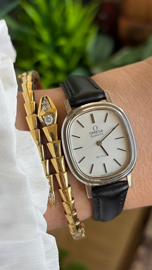Vintage Omega De Ville Sleek Dress Watch in Black Leather Strap Rounded Rectangular Face Original Buckle