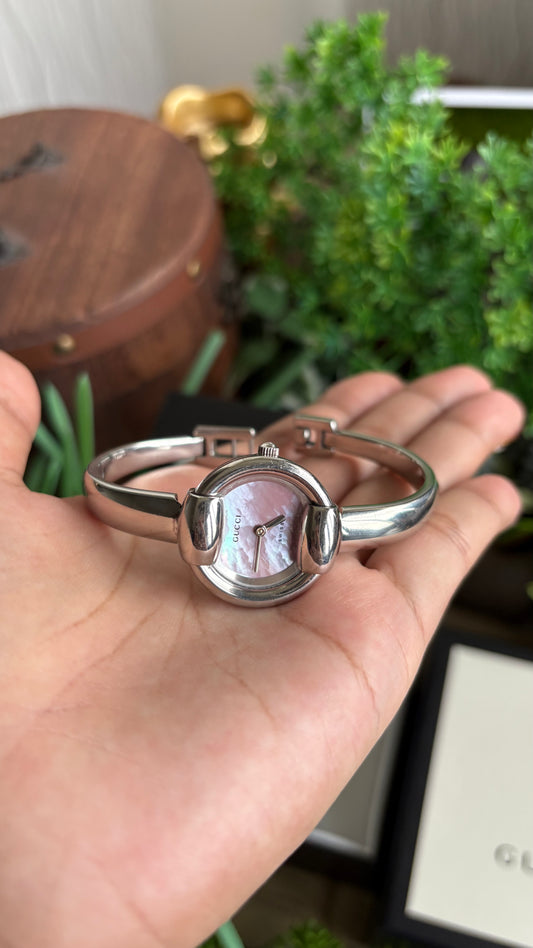 Vintage Gucci 1400L Watch in Silver Tone Mother of Pearl Pink Dial with Gucci Box