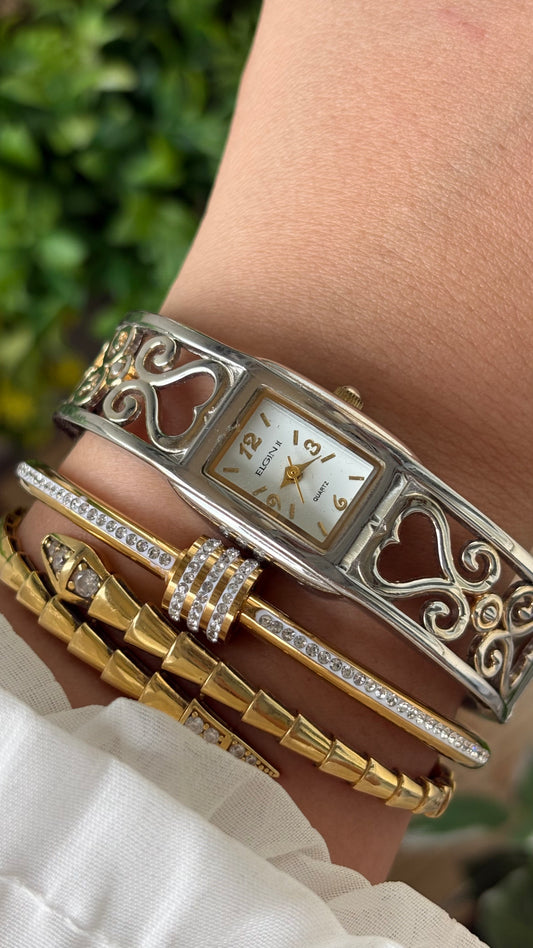 Rare Vintage Elgin II Princess Heart Details Bangle Watch in Silver Tone Quartz #00229