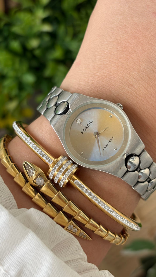 Rare Vintage Fossil Swirl Bracelet Watch in Silver Tone Quartz NOS #00253