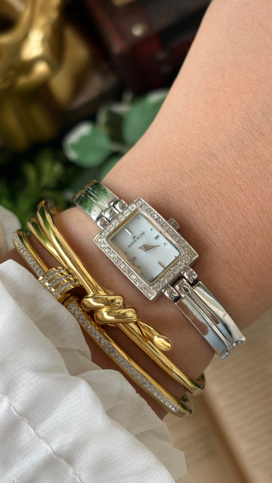Rare Vintage Dainty Anne Klein Rhinestone Bezel Semi Bangle Watch in Silver Tone Mother of Pearl Dial Quartz
