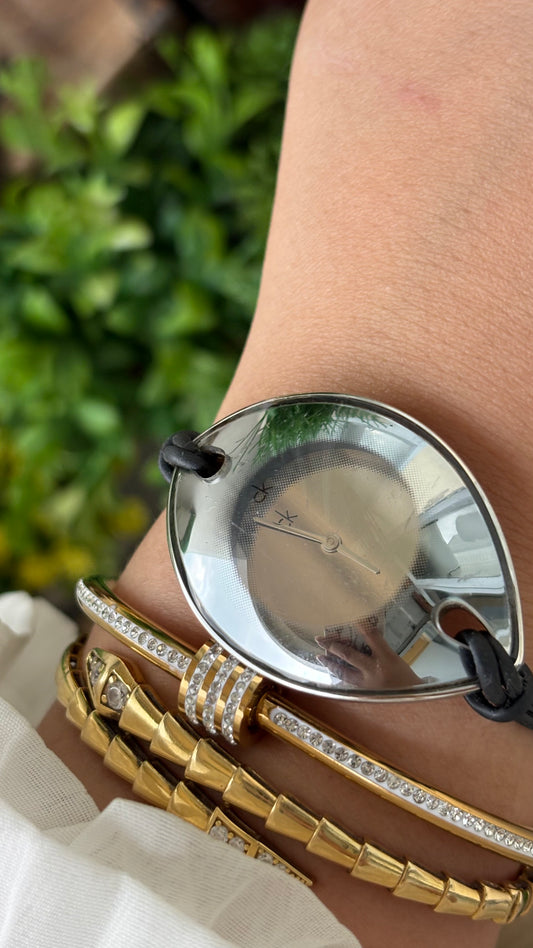 Extremely Rare Vintage Calvin Klein Swiss Silver Mirror Eye Dial Watch in Black Rope Cord Quartz #00238