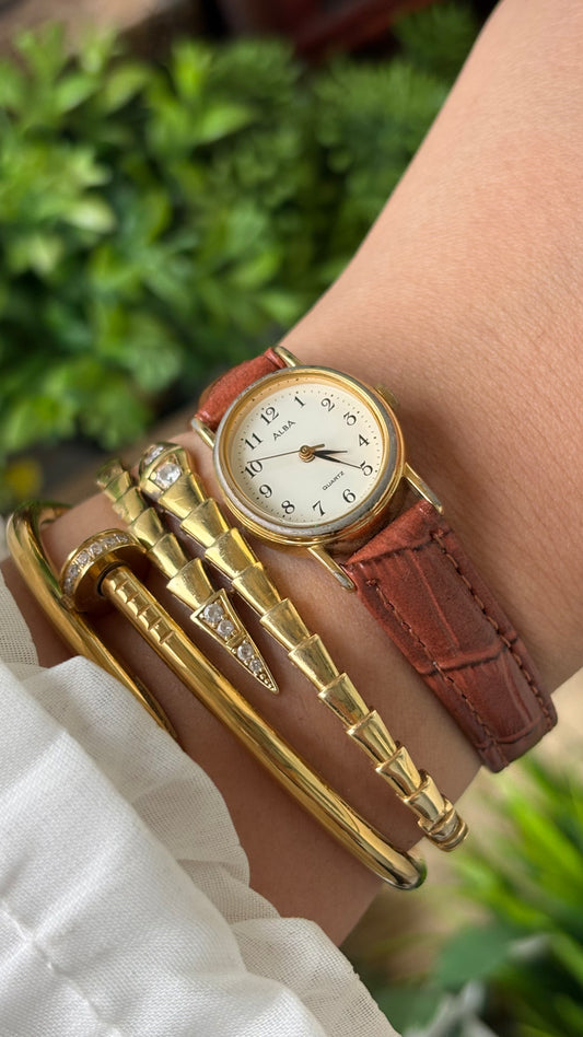 Dainty Vintage Alba Classic Watch in Gold Tone Brown Leather Oval Dial Quartz #00921