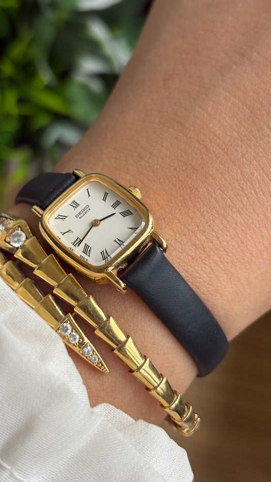 Vintage Seiko Mini Tank Watch in Black Leather Strap