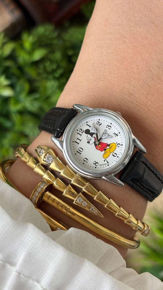 Rare Vintage Lorus Mickey Mouse Watch in Silver Tone Black Leather Quartz #00932