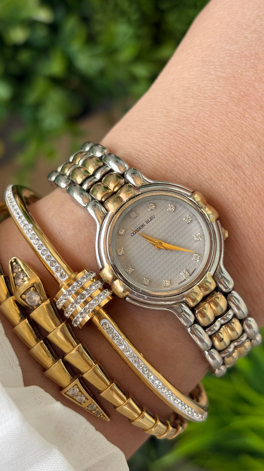 Vintage Cordon Bleu Classic Watch in Two-Tone Grid Rhinestone Indices Dial Quartz #00629