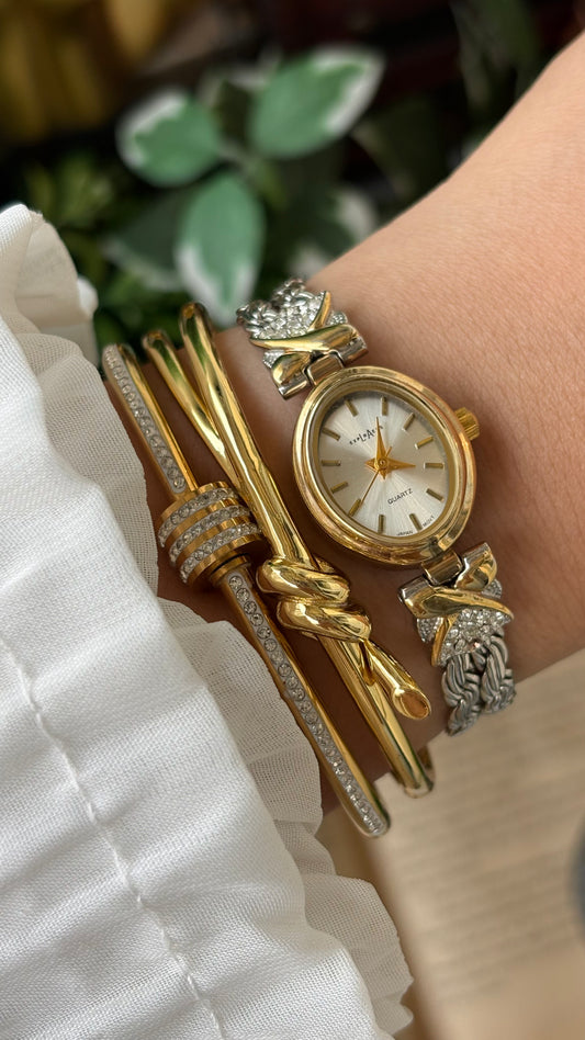 Vintage SunRise Elegant Semi Bangle Watch in Two-Tone Quartz Rhinestone Dial