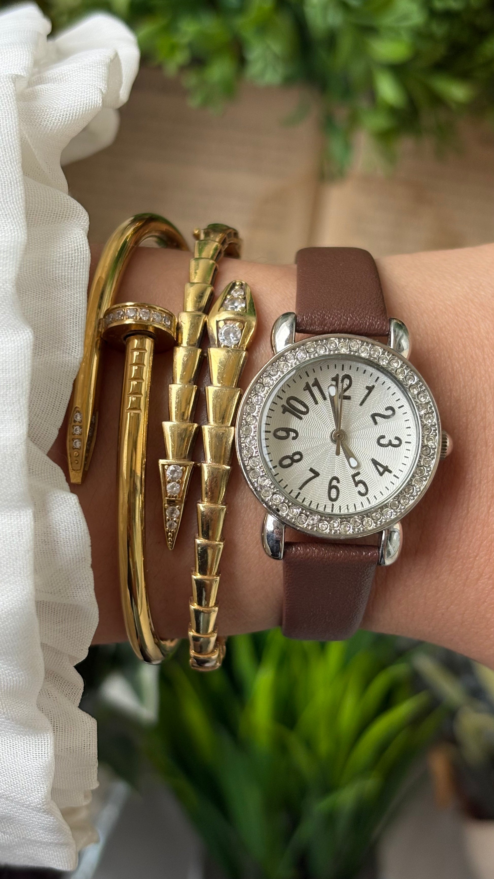 Vintage Merona Rhinestone Bezel Zigzag Dial Watch in Silver Tone Brown Leather Quartz #00943