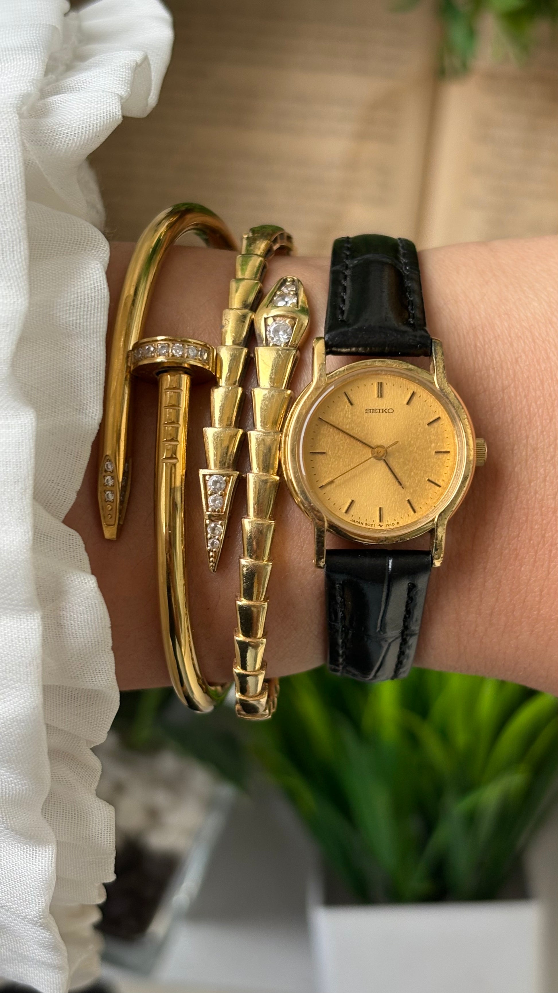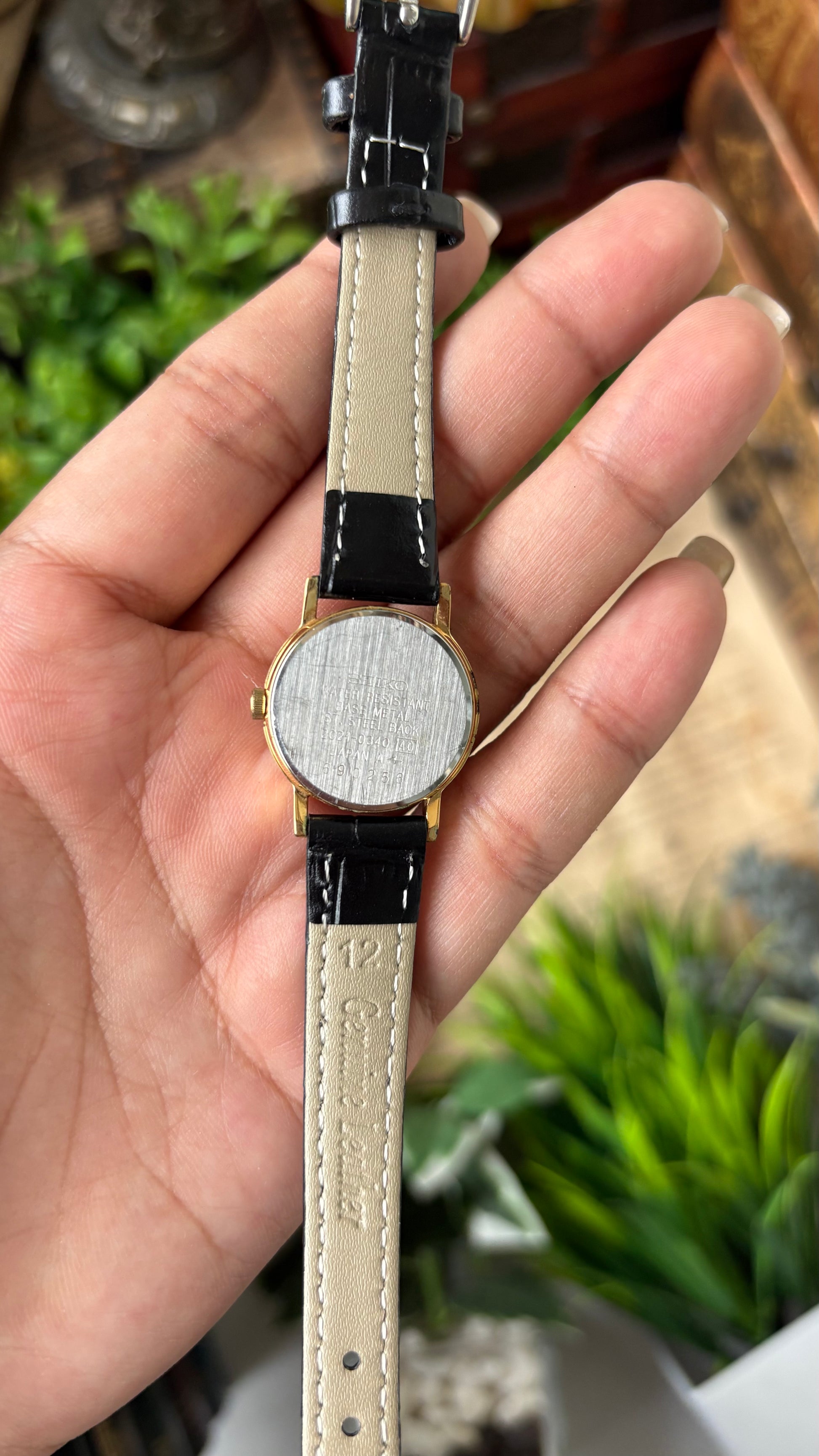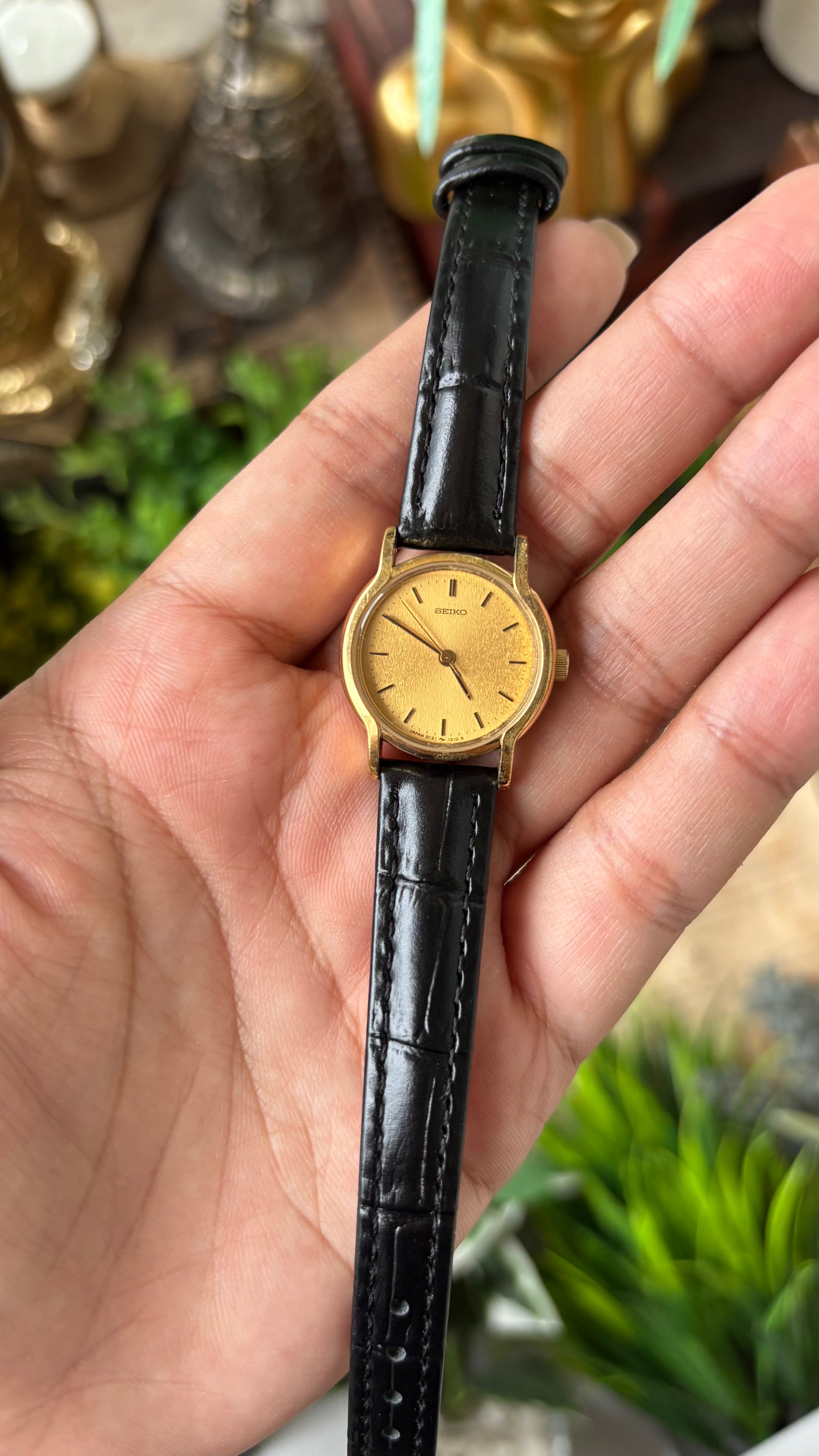 Dainty Vintage Seiko Yellow Gold Dial Minimalist Watch in Gold Tone Black Leather #00938