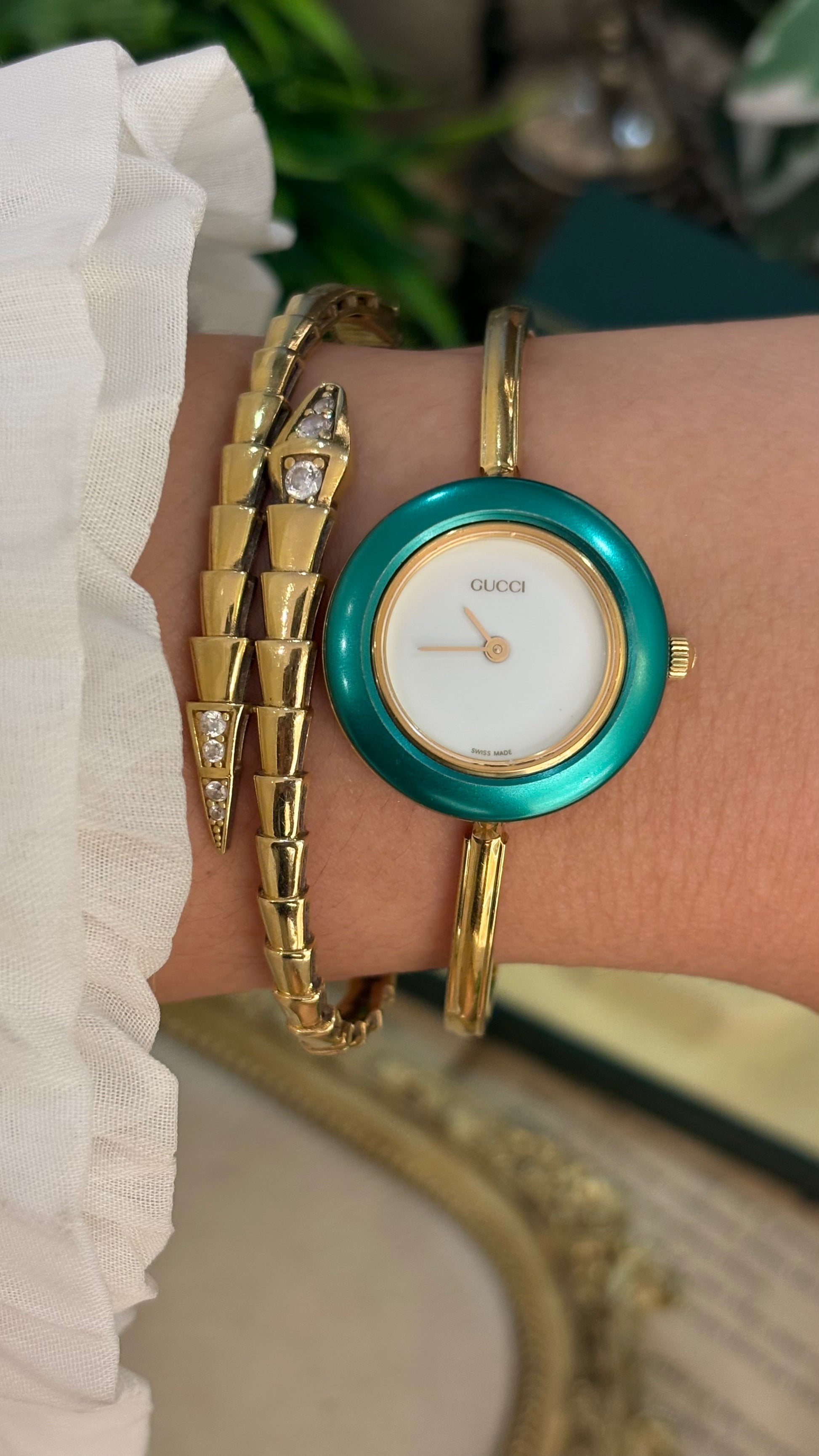 Extremely Rare Gucci Interchangeable Bezel Bangle Watch with Metal Bezel Set in Gold Tone Quartz Swiss