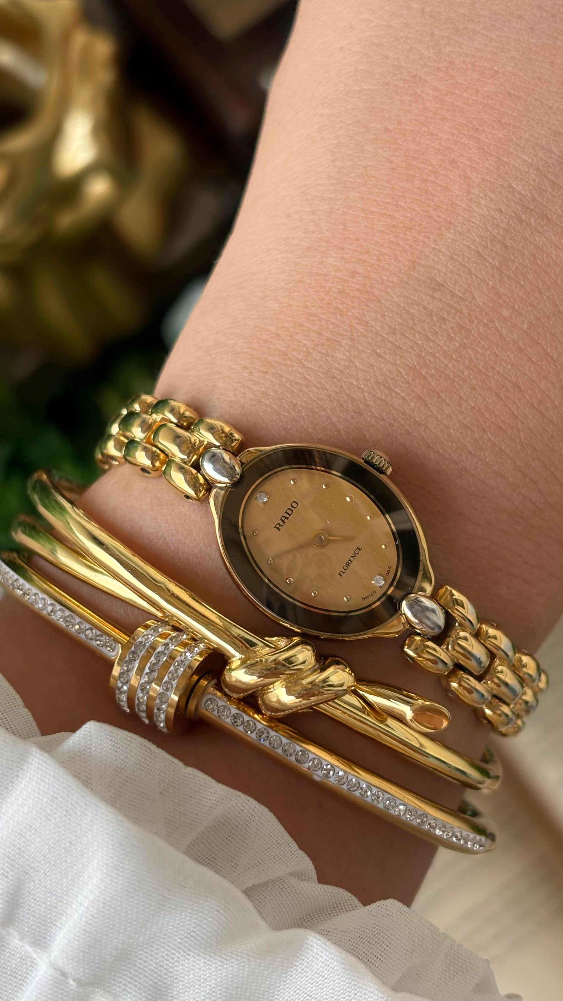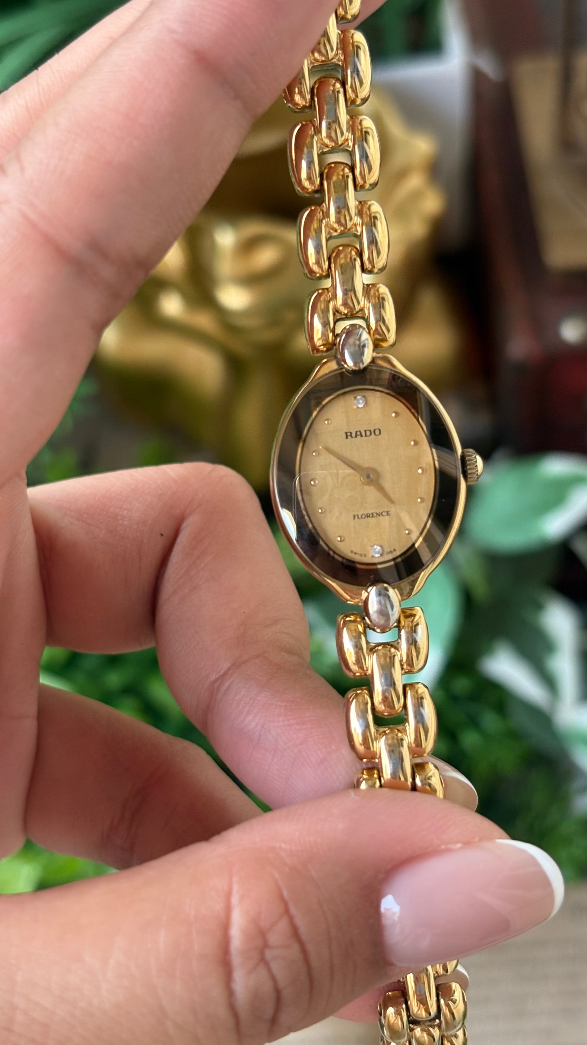Extremely Rare Vintage Dainty Elegant Rado Florence Swiss Bracelet Watch in Gold Tone Rhinestone Oval Dial Quartz